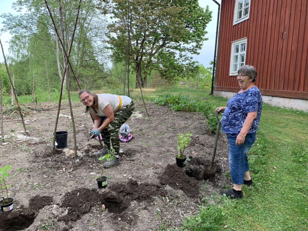Nu är värmen här och allt har satt fart ordentligt, både ogräs, perenner, odlare och pollinatörer! Projektet har kunnat köpa in flera olika fruktträd och buskar som är planerade nu. Det dröjer tyvärr något år innan de etablerat sig ordentligt så under detta år får vi mest fokusera på att skydda nykomlingarna i trädgården.