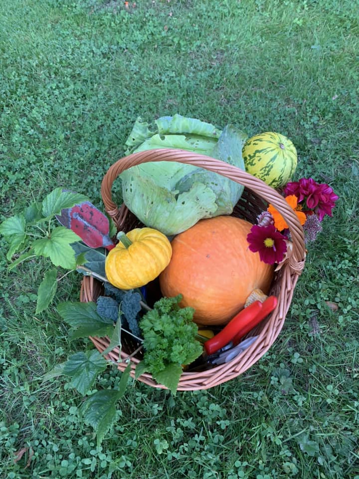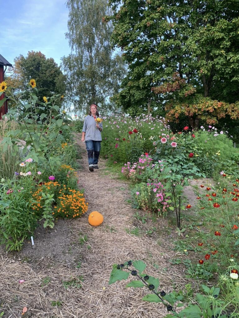 Sommaren börjar avta men på Gråbo Trädgård blommar det fortfarande av både ringblommor, ballongblommor, jordärtskocka, zinnia och många fler blommor. På dagarna är det fortfarande fullt ös bland pollinerarna som surrar (och ibland ser ut att sova) i blommorna. Det skördas bönor, squash och många fina pumpor! Det som händer nu är att vi rensar bort det som klingat av, samlar komposthögar här och där för att mylla jorden senare i höst. Vi gläds åt att hitta många maskar i jorden, något som inte förekom alls för några månader sedan.